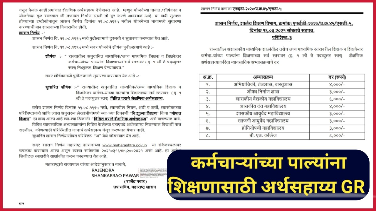 कर्मचाऱ्यांच्या पाल्यांना शिक्षणाच्या सर्व स्तरावर ( 1 ली ते पदव्युत्तर स्तर पर्यंत ) विहित दराने अर्थसहाय्य करणेबाबत सुधारित GR