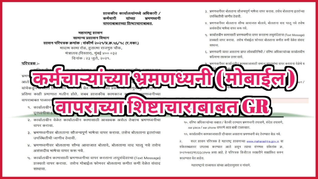 सरकारी कार्यालयांमध्ये कर्मचाऱ्यांच्या भ्रमणध्यनी ( मोबाईल ) वापराच्या शिष्टाचाराबाबत महत्वपुर्ण शासन निर्णय !