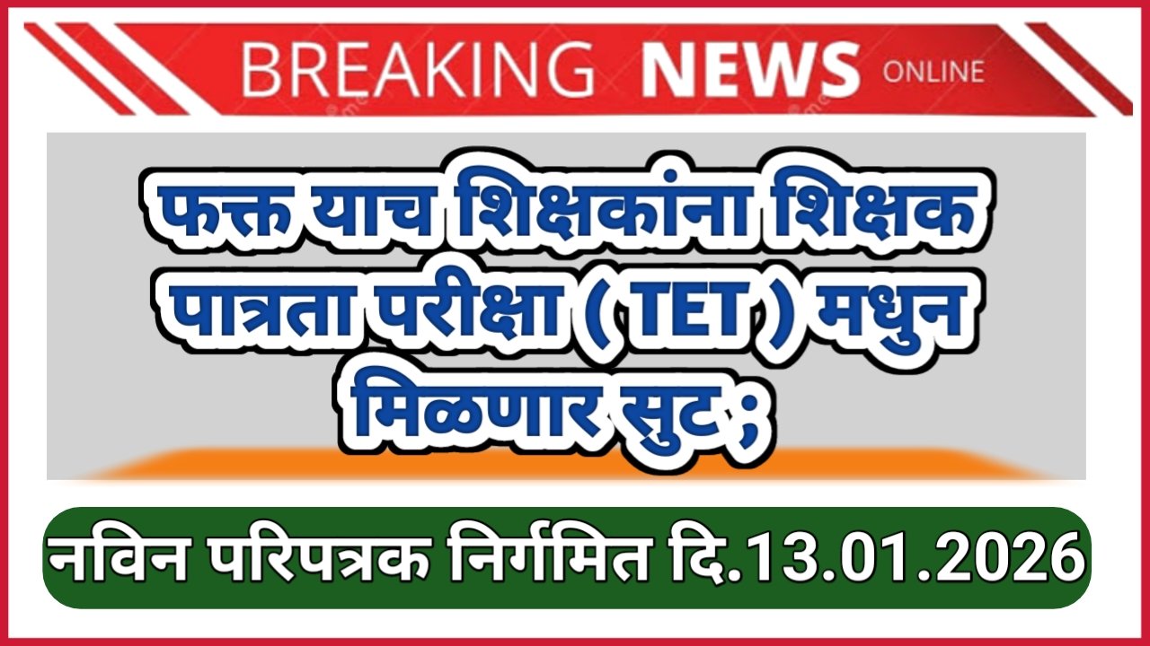 फक्त याच शिक्षकांना शिक्षक पात्रता परीक्षा ( TET ) मधुन मिळणार सुट ; नविन परिपत्रक निर्गमित दि.13.01.2026