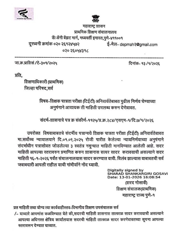सदर माहिती ही शिक्षणाधिकारी यांच्या स्तरावरुन प्रमाणित करुन सरकारला सत्वर सादर करावयाची असल्याने दिनांक 16.01.2026 पर्यंत सदर माहिती विनाविलंब सादर करण्याचे निर्देश देण्यात आले आहेत .
