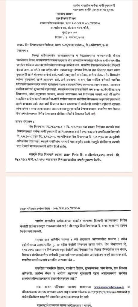 सदर निर्णयानुसार नमुद करण्यात आले आहेत कि, राज्य सरकारच्या वित्त विभाग मार्फत दि.25.04.1988 तसेच दिनांक 05.02.1990 रोजीच्या शासन निर्णयांमध्ये नमुद केल्यानुसार घरभाडे भत्ता मिळविणेकरीता कर्मचाऱ्यांनी मुख्यालयी राहणे आवश्यक आहे ..