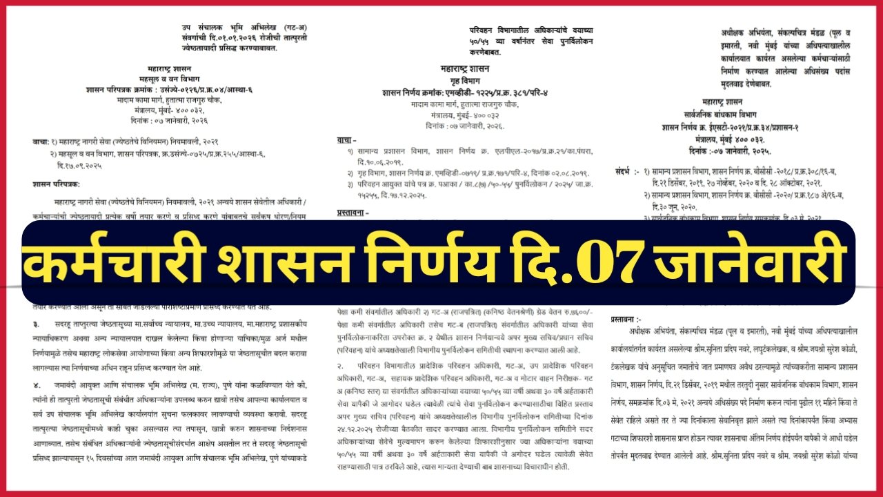 राज्य अधिकारी / कर्मचाऱ्यांच्या बाबत आज दिनांक 07.01.2026 रोजी निर्गमित झाले 03 महत्वपुर्ण GR